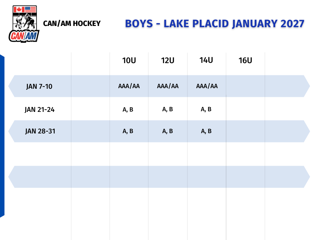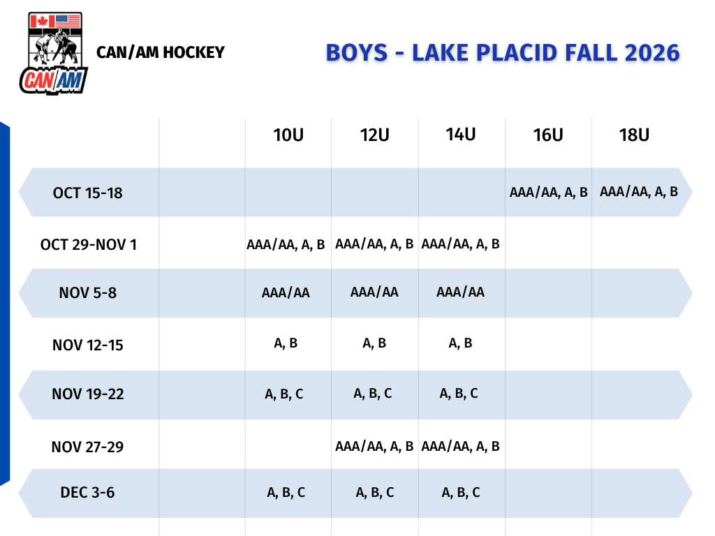 Tournament Package pricing will be available on Friday, May 15 and will coincide with the start of our Early Application period for our Fall 2026 and January 2027 Lake Placid Challenge Cup Tournaments.